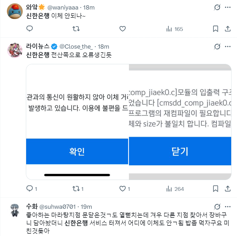 트위터 등 각종 소셜 미디어에서도 관련 불편을 호소하는 글들이 실시간으로 올라오고 있어, 이는 일부 사용자의 문제가 아닌 신한은행 시스템 전반의 문제로 파악됩니다.